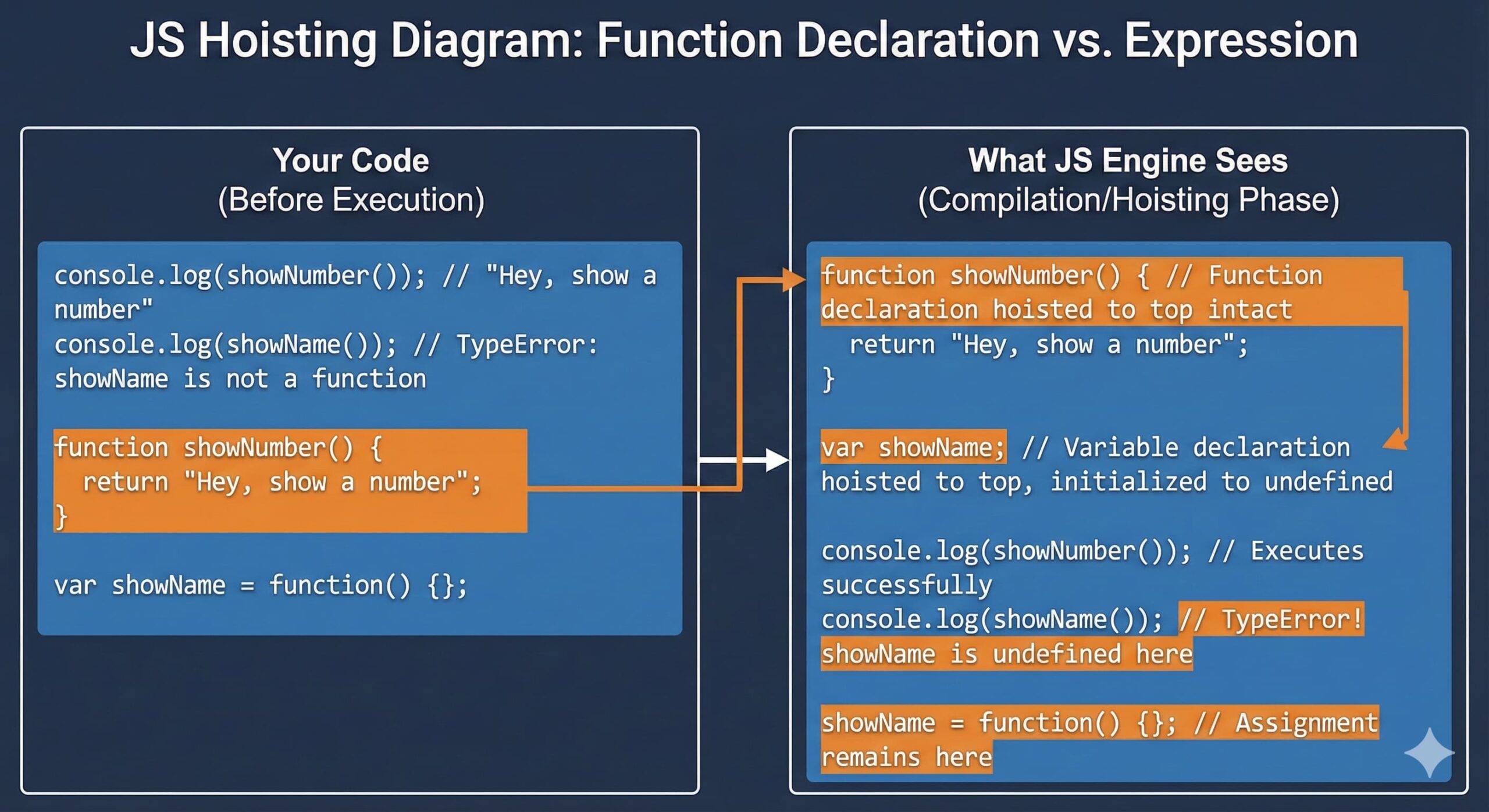 | Compiling Phase | Declarations stored (JS sets up variables + functions) |