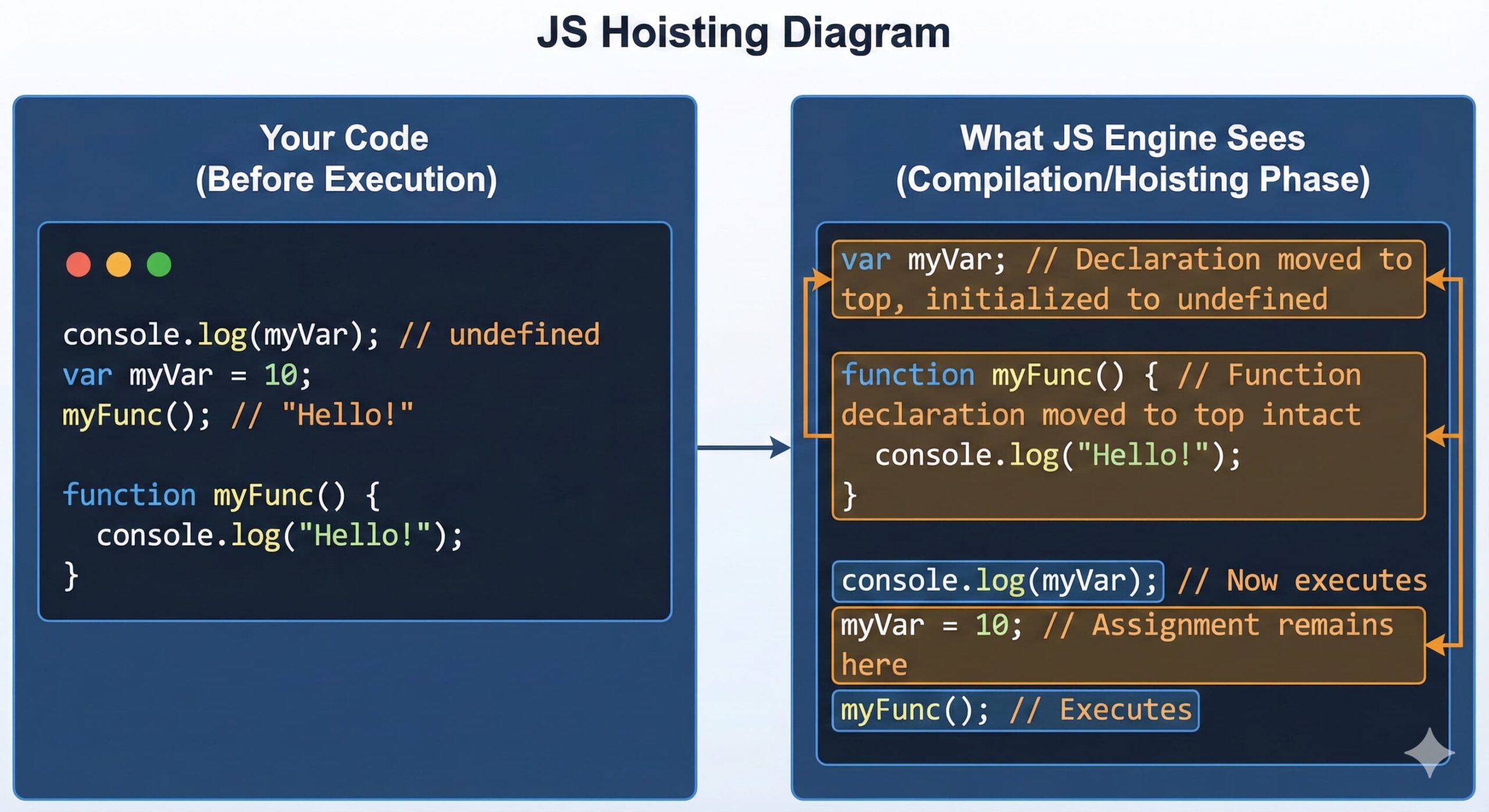 | Hoisting | The declaration happens first, the assignment later |
